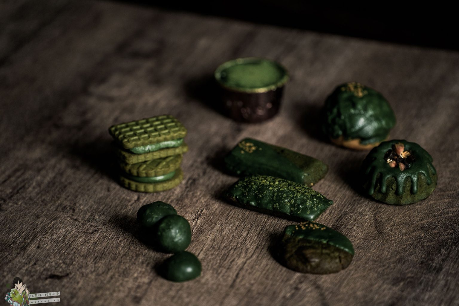 抹茶香草雪球、抹茶開心果夾心餅乾、抹茶拿鐵夾心餅乾、抹茶巧克力堅果酥餅