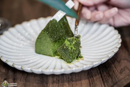 蛋糕捲細膩不乾,中間抹茶鮮奶油在上桌後就一副快要爆漿的樣子,品嚐起來茶香濃郁不帶苦澀,屬於比較流動的那種鮮奶油內餡,輕輕一壓就直接爆出來。