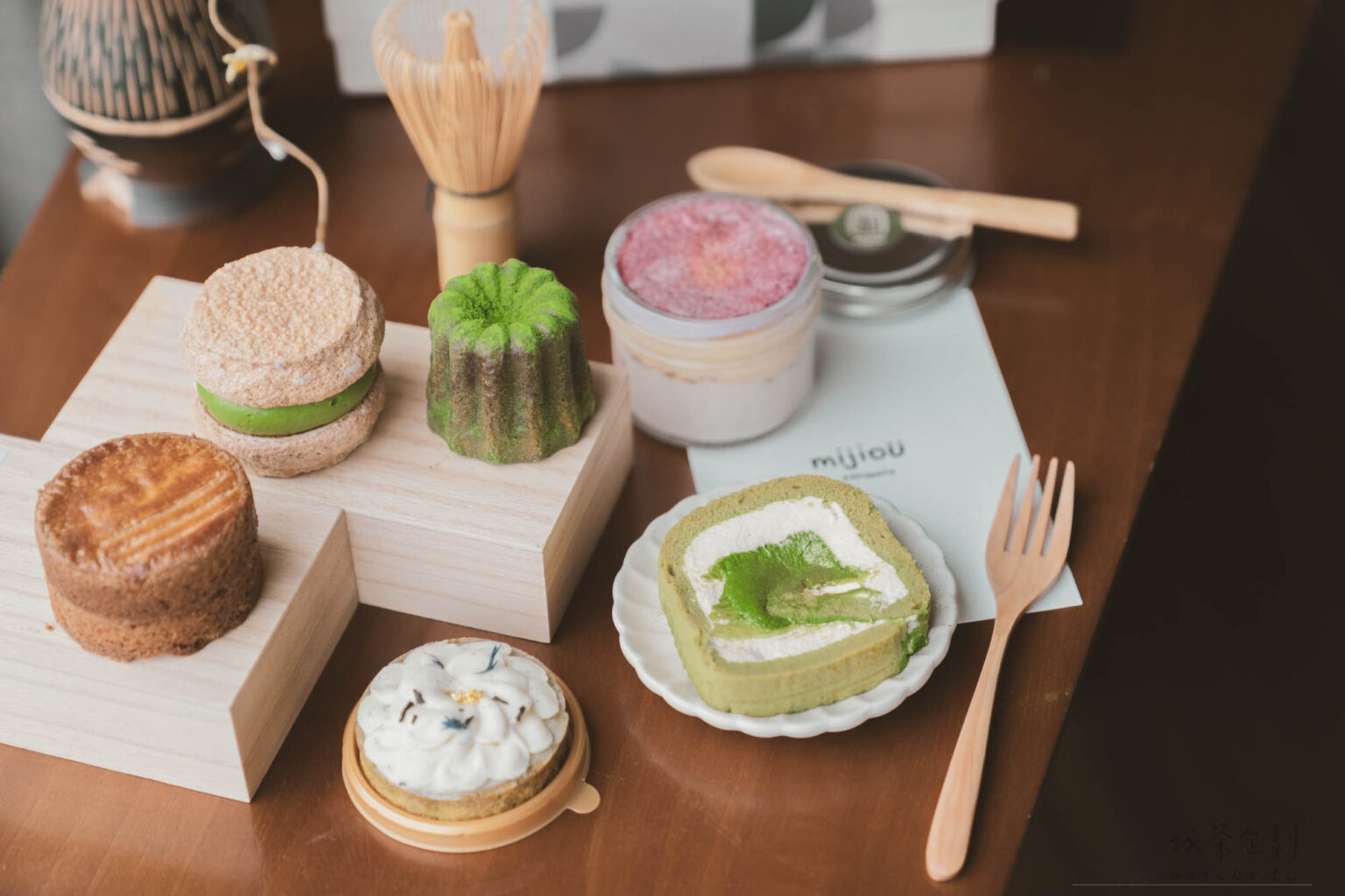 從達克瓦茲到蛋糕卷,咪玖選用的抹茶都是丸久小山園的薄茶用抹茶,茶香和回韻都表現優異。